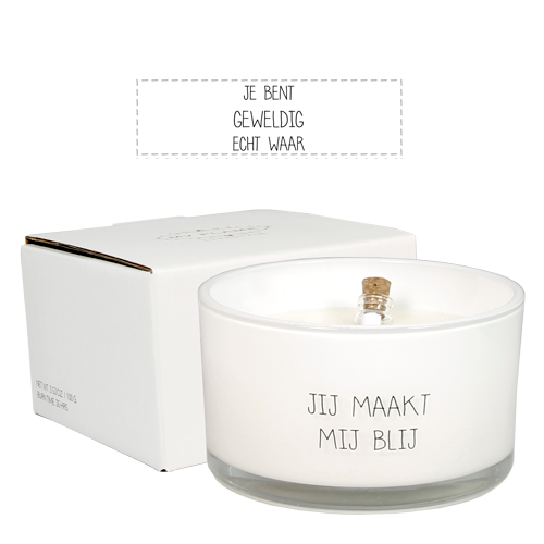 Geurkaars met flessenpost 'Jij maakt mij blij'