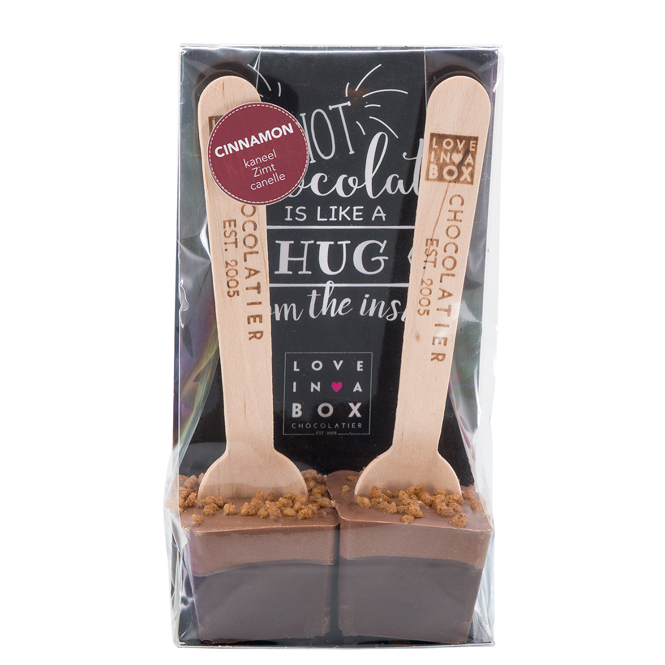 De Love in a Box Chocolade lepels Puur met koffie zijn gemaakt van krachtige pure chocolade met melkchocolade met kaneel gedecoreerd met kaneelsuiker.