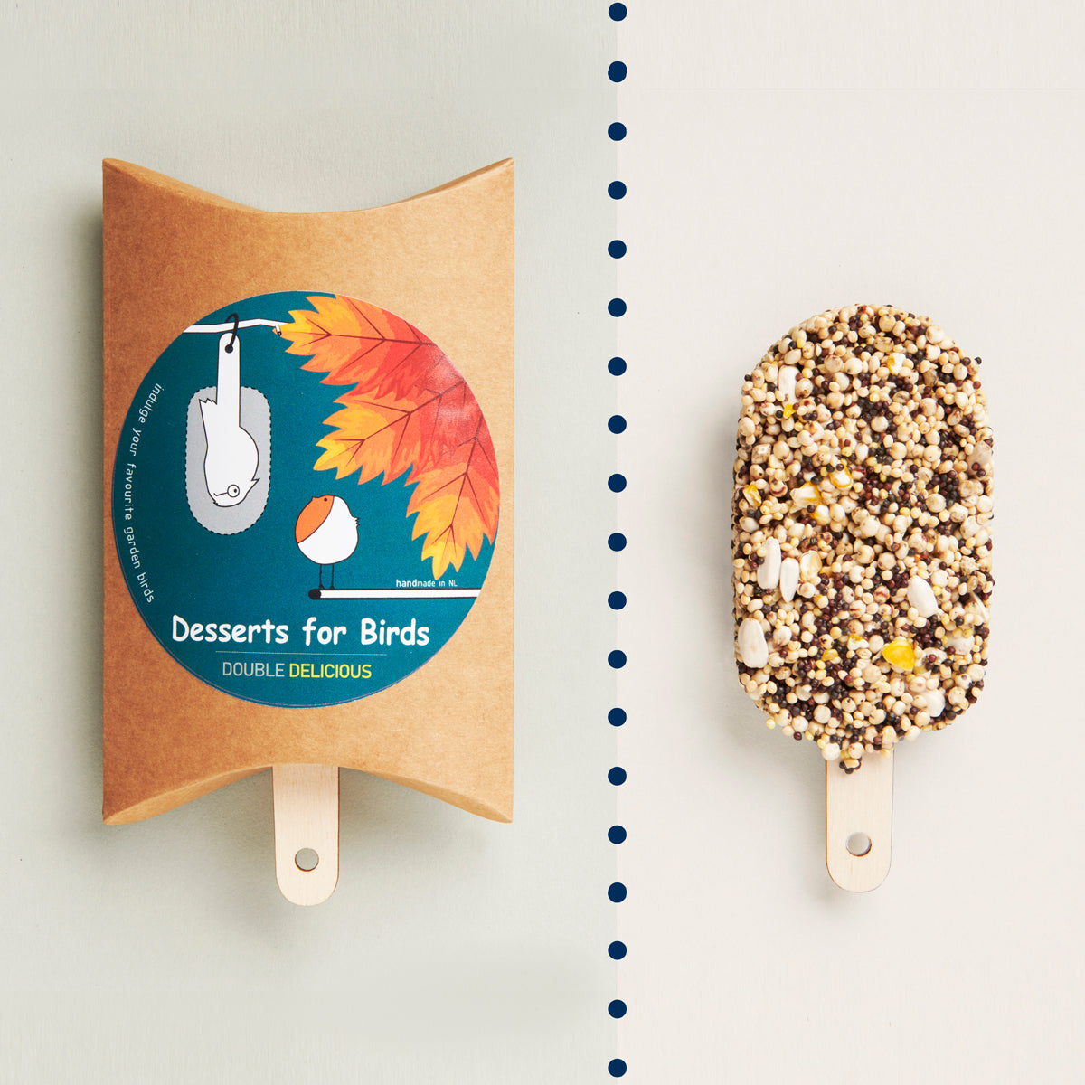 Leuke verrassing: nadat de vogels het toetje met smaak hebben verorberd, komt er een origineel laser gesneden ijsstokje tevoorschijn, in de vorm van een roodborstje, een koolmeesje of een halsbandparkietje.
