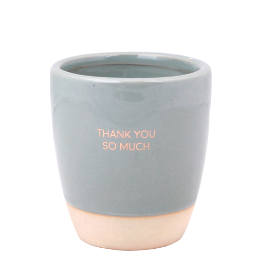 Als de kaars is opgebrand, houd je een hip koffiekopje over in pastelgroen gemaakt van keramiek en afgewerkt met een mooie gouden print 'Thank you so much'.
