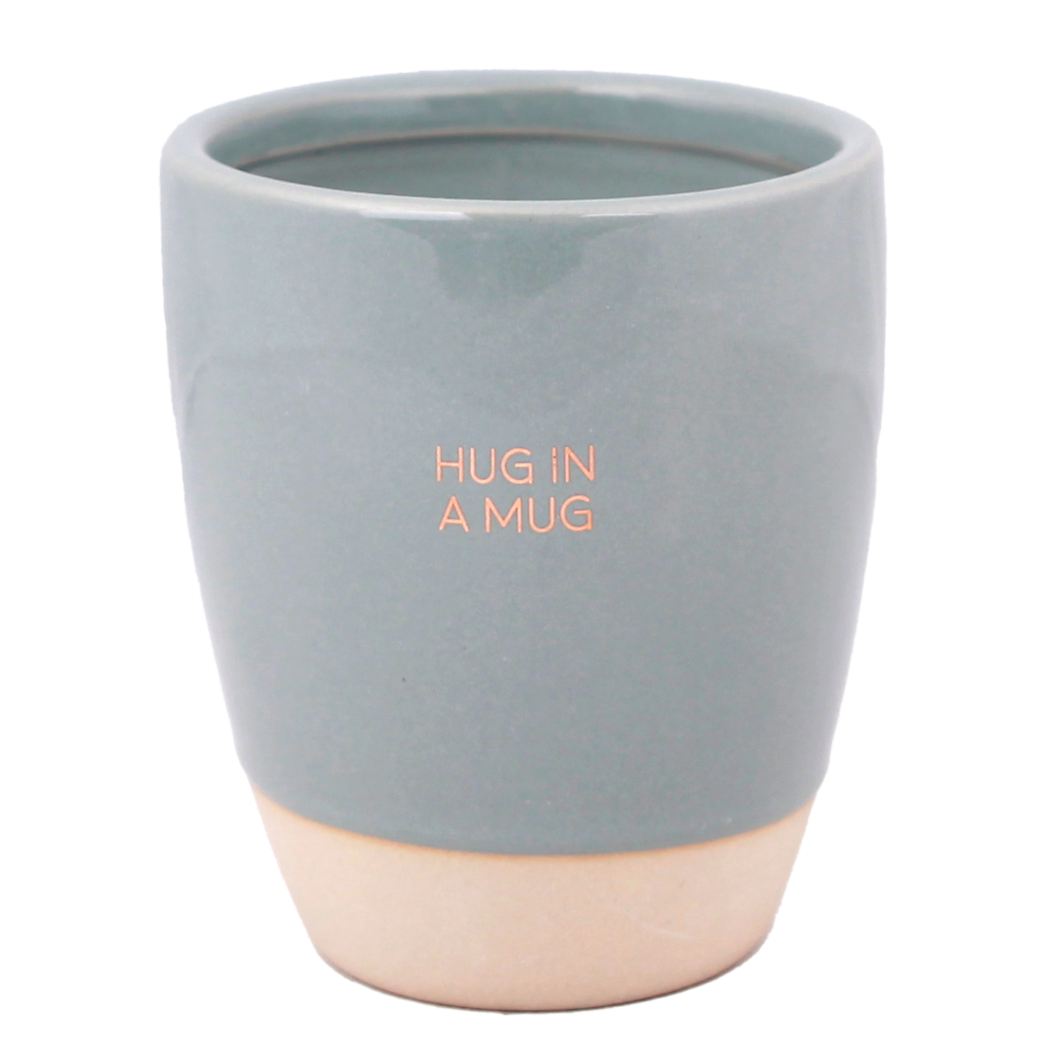 Als de sojakaars is opgebrand, houd je een hippe theekop over in pastelgroen gemaakt van keramiek en afgewerkt met een mooie gouden print 'Hug in a Mug'.