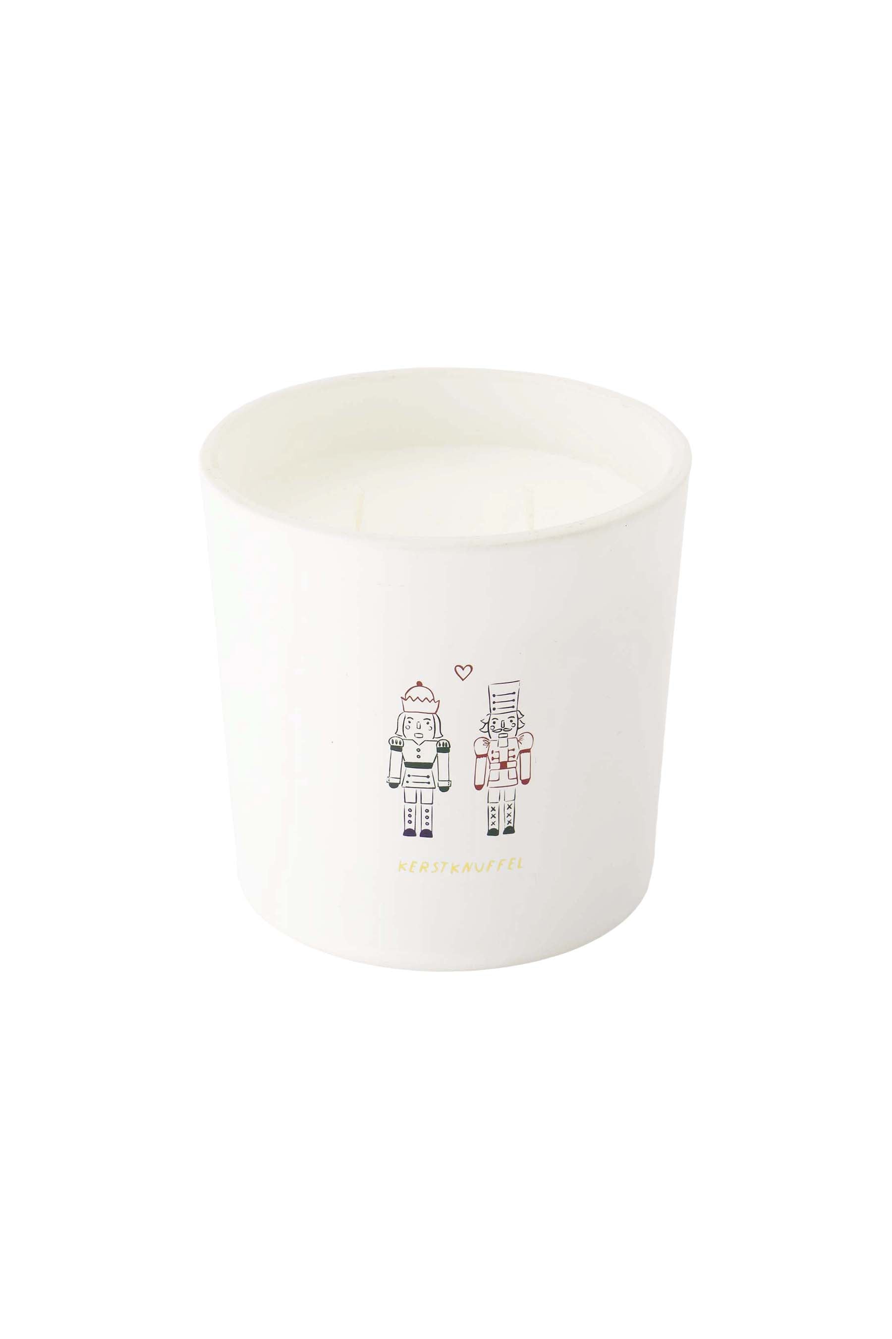 Deze geurkaars glas is perfect voor een gezellige kerstsfeer. Ze heeft een charmante notenkrakers en kerstknuffel illustratie.